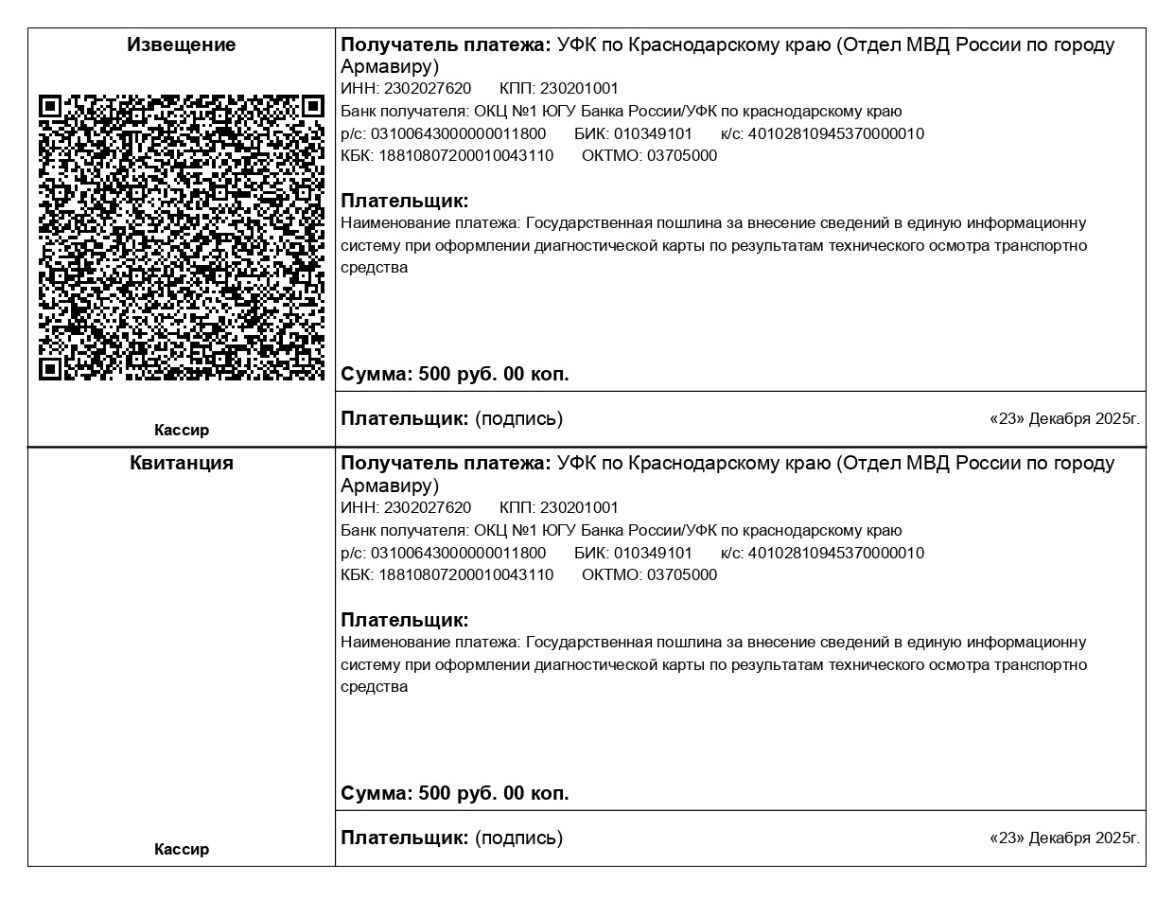 Оплатить госпошлину можно заранее, по QR-коду на нашем сайте (рекомендуем производить оплату через приложения банков СБЕР или ВТБ, так как другие банки не присваивают необходимый код УИП ) или при предоставлении транспортного средства на станцию технического осмотра. Также вы можете скачать квитанцию для оплаты и провести оплату в офисах предчтавителей банков.